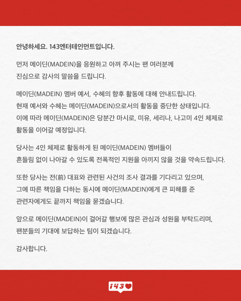ต้นสังกัดของวง MADEIN ออกแถลงการณ์อย่างเป็นทางการเกี่ยวกับอนาคตการทำกิจกรรมของสมาชิก เยซอ (Yeseo) และ ซูฮเย (Suhye)