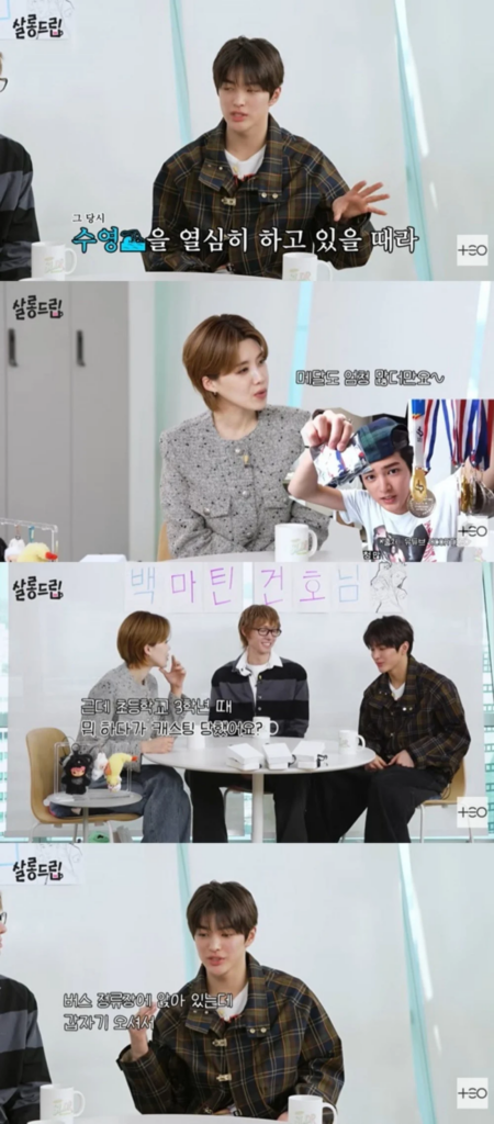 พิธีกร จางโดยอน จึงถามถึงสถานการณ์ตอนนั้นอย่างละเอียด กอนโฮเล่าต่อว่า “ผมนั่งอยู่ที่ป้ายรถเมล์ แล้วมีคนเข้ามาถามว่า ‘รู้จัก BTS ไหม?’ ตอนแรกผมก็ไม่ได้สนใจมาก จนเขายื่นนามบัตรของ Big Hit Entertainment ให้”