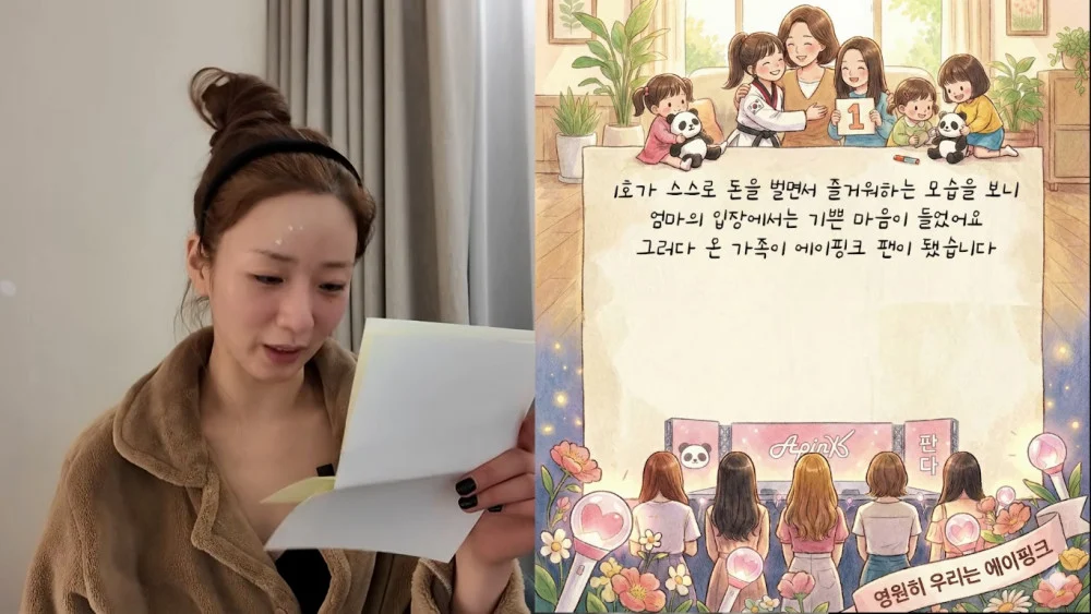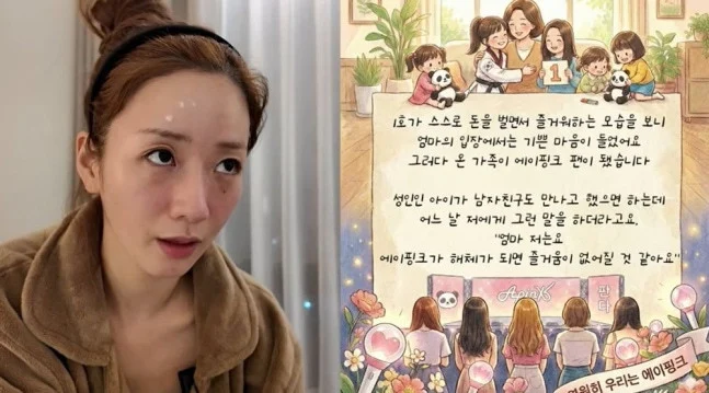 คุณแม่ยังเล่าว่าภูมิใจที่ได้เห็นลูกสาวเติบโตมากับ Apink จนตอนนี้ทำงานหาเงินเองได้แล้ว แม้บางครั้งจะอยากให้ลูกสาวมีแฟน แต่ลูกกลับบอกว่าความสุขที่สุดของเธอก็คือ Apink