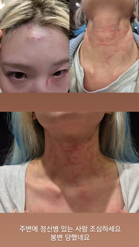 ต่อมา ต้นสังกัด Rolling Star Entertainment ได้ออกแถลงการณ์ชี้แจงว่า เหตุการณ์เกิดขึ้นเมื่อวันที่ 18 มีนาคม ขณะที่ศิลปินมี ปากเสียงกับบุคคลไม่ทราบชื่อบนถนน และสถานการณ์บานปลายจนเกิดการปะทะกันเล็กน้อย ส่งผลให้เธอได้รับ บาดแผลถลอกเล็กน้อย