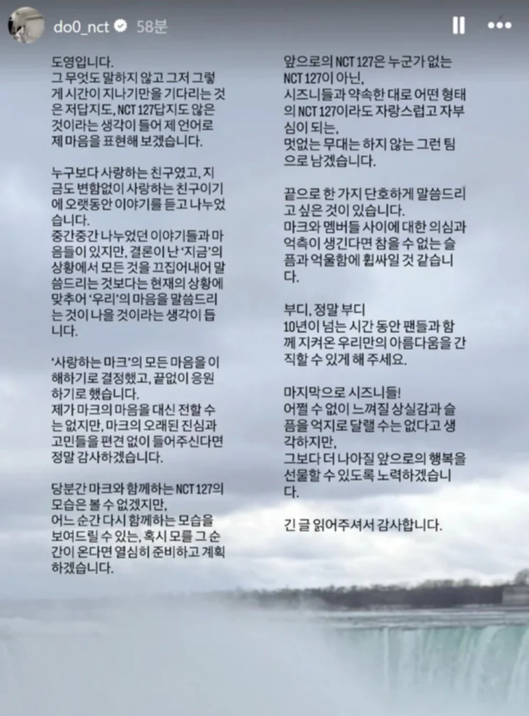 โดยองเผยว่าเขาไม่อยากปล่อยให้เวลาผ่านไปโดยไม่พูดอะไร เพราะมันไม่ใช่ตัวเขาและไม่ใช่สิ่งที่ NCT 127 เป็น พร้อมย้ำว่าเขาได้พูดคุยกับมาร์คมาอย่างยาวนาน และเคารพการตัดสินใจของเพื่อนคนนี้
