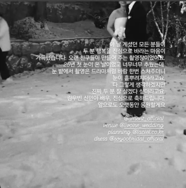 ด้านสตูดิโอที่ดูแลงานถ่ายภาพแต่งงานของทั้งสองคน ยังได้เผยเบื้องหลังการถ่ายภาพ โดยระบุว่าถ่ายทำในสถานที่ที่ถูกปกคลุมด้วยหิมะ พร้อมปล่อยวิดีโอที่เห็น Kim Woo Bin และ Shin Min Ah โพสท่าด้วยกัน แม้จะไม่ได้เห็นใบหน้าแบบชัดเจน แต่แฟนๆ ก็แฮปปี้ที่ได้เห็นบรรยากาศสุดโรแมนติกของทั้งคู่