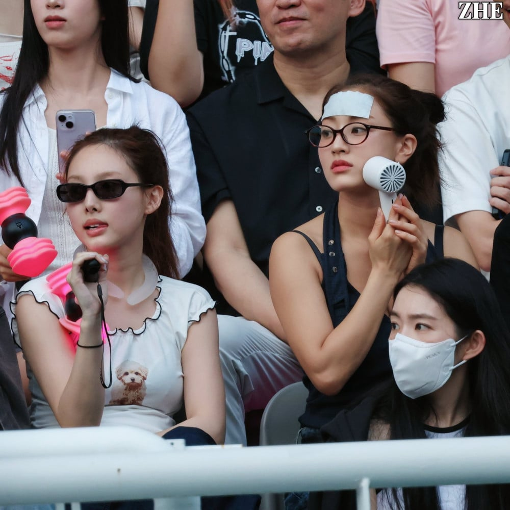 นายอน และ จีฮโย ปรากฏตัวพร้อม แผ่นแปะเย็นบนหน้าผาก แว่นสายตา และ พัดลมพกพา ที่ติดอยู่กับหน้าแบบจัดเต็มเพื่อสู้กับอุณหภูมิทะลุ 35 องศาในสนามกลางแจ้งก่อนพระอาทิตย์ตก แถมยังแชร์แผ่นแปะเย็นให้ ไอรีน และ ซึลกิ Red Velvet ที่นั่งแถวหน้าอีกด้วย!
