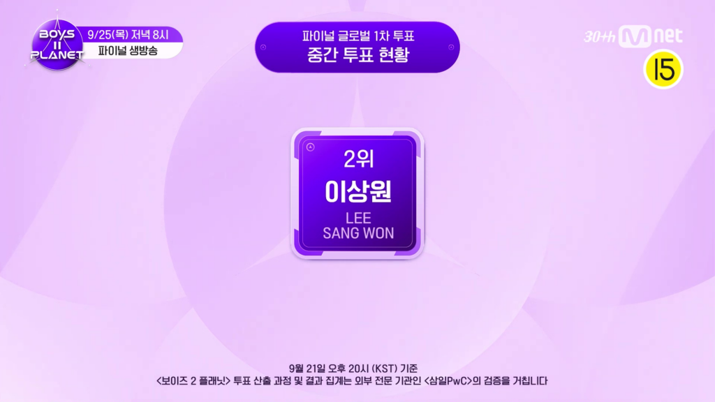 เมื่อวันที่ 21 กันยายน ทีมงานได้ปล่อยทีเซอร์สำหรับตอนสุดท้ายของรายการ โดยท้ายคลิปมีการเปิดเผยว่า อีซังวอน (Lee Sang Won) ผู้ที่ครองอันดับ 1 มาโดยตลอดตั้งแต่เริ่มซีซั่น บัดนี้ได้ร่วงลงมาอยู่อันดับที่ 2 แล้ว